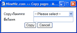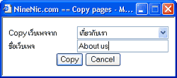 เมื่อทำการคลิ๊กที่ไอคอน “Copy page” แล้วจะปรากฏหน้าต่างใหม่ขึ้นมาเพื่อให้เลือกหน้าที่ต้องการคัดลอก แล้วหลังจากนั้นให้ใส่ชื่อหน้าเว็บเพจใหม่ลงไป แล้วกดปุ่ม copy